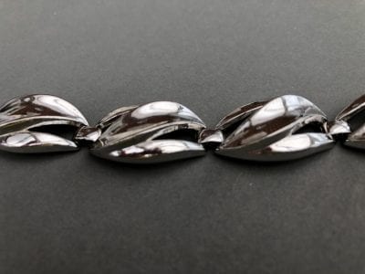 A Trifari silver plate shiny leaf design bracelet from the 1950s. Signed on the back of the fold over clasp ‘Trifari Pat Pend’.