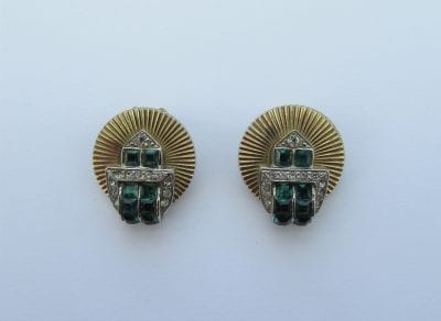 Jewelcraft 1950s Emerald glass and paste clip on earrings. A very classic expensive style of earrings with square cut emerald green stones and clear paste. They are set in a light coloured gold plated metal, with ridges to the outside, although these have an Art Deco style to them they were produced in the 1940s/1950s.