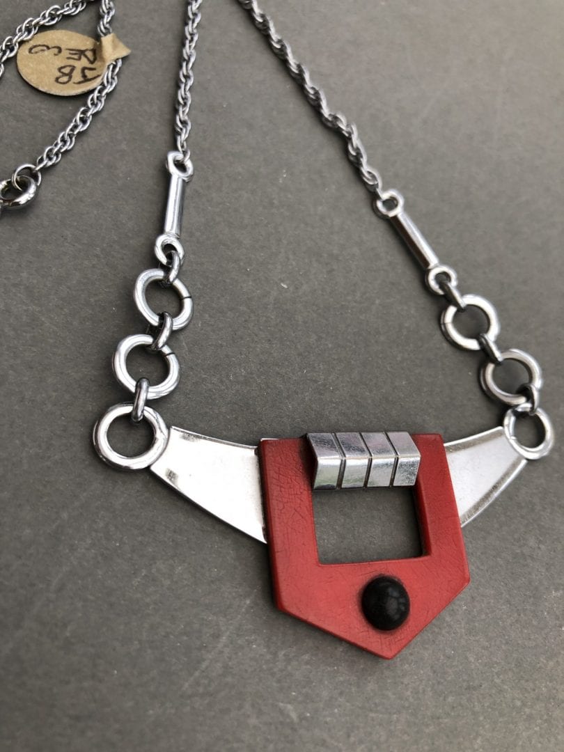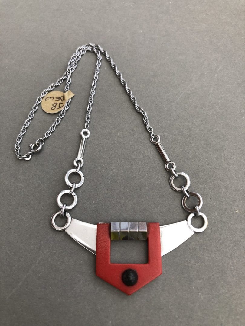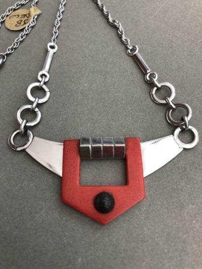 This 1920s Jakob Bengel Red Necklace is in chrome with a lipstick red galalith panel. A very iconic Art Deco necklace with all the different architectural deco shapes incorporated in it. It is in exceptional condition.