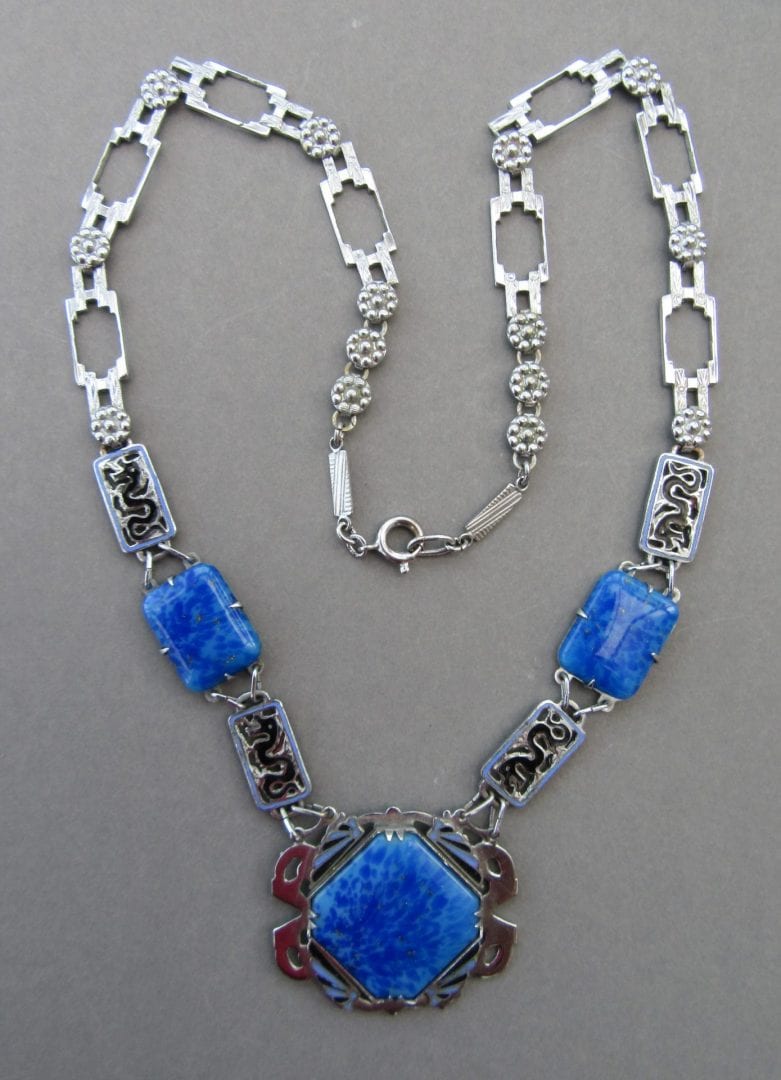 This is an amazing 1920s lapis blue glass necklace with chrome and enamel panels. The enamel panels depict black fantasy sea serpents, this is the best description I can give. There are also art deco enamel panels in black and pale blue which surround the centre panel.
