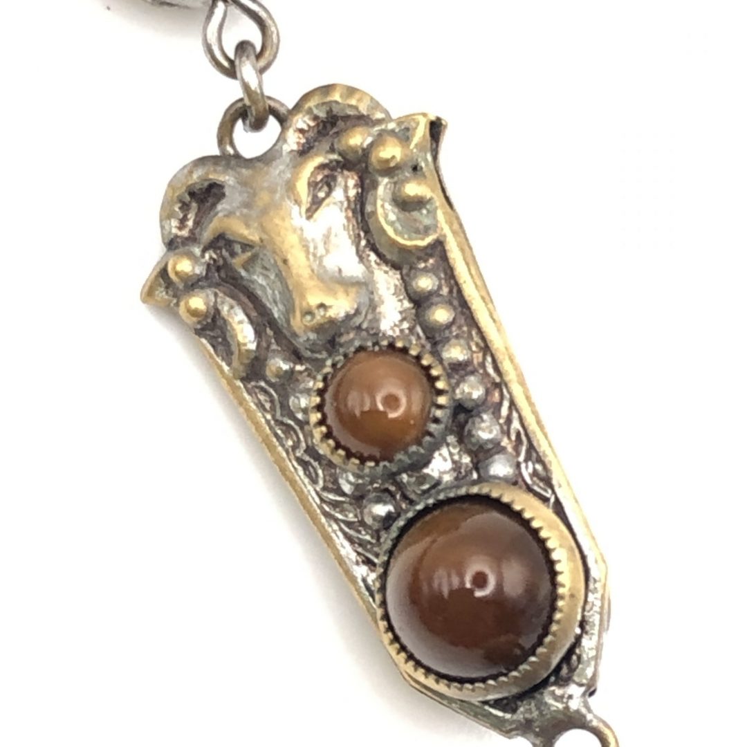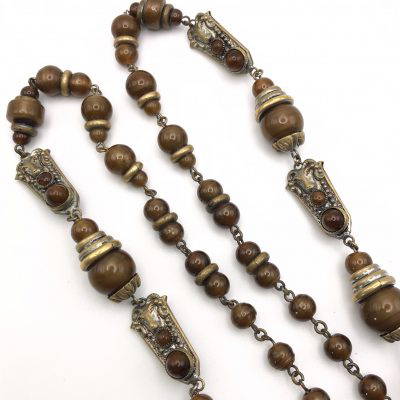 One of the rarer Neiger long necklaces with the panels of Rams head motifs. Lots of lovely Neiger elements here with the saw tooth edging, cabochon stones, ‘crown’ bead caps and ‘Chinese hat’ glass beads. The beads are in two shades of brown, the larger beads have a swirl in them.