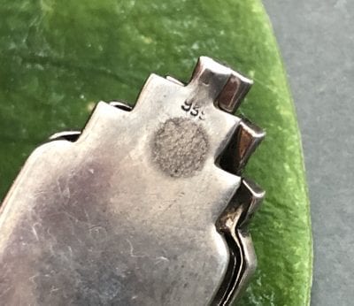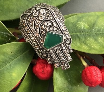 This 1920s Silver marcasite dress clip is set with a triangular shaped chrysoprase stone. This is an unusual curved shape and has a flash of green from the chrysoprase stone.