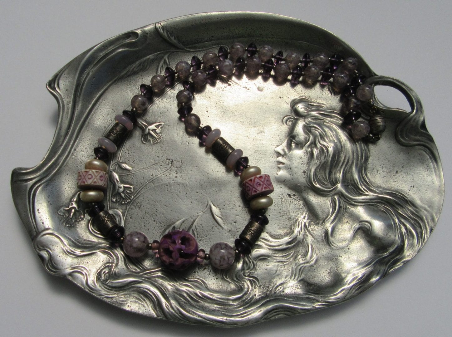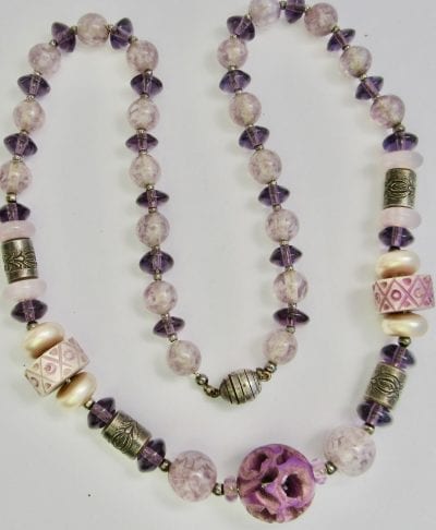 A Louis Rousselet French Purple and Lilac Necklace from the 1930s. The necklace is a combination of Purple and lilac glass beads and galalith (French Bakelite) carved beads. There are also glass pearl donut beads and silver metal patterned cylindrical beads, a truly delightful combination.