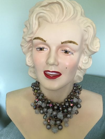 This 1950s grey collar necklace comprises of glass beads in grey pearls, aurora borealis crystal and pale blue venetian Murano aventurine beads. There are 4 rows of beads in various lengths which create a cascading waterfall effect of beads. The beads are linked together with metal connectors so is very strong.