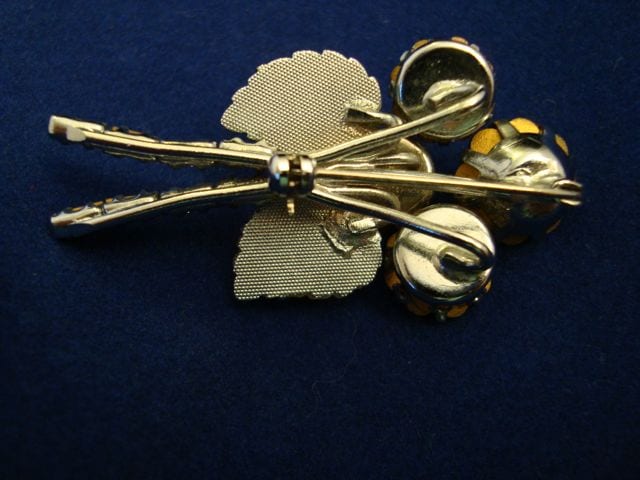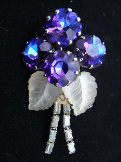 These type of stones were often used in quality brooches similar to Juliana & De Lizza. Two opaque glass leaves and baguette stones in the stem of the flowers.