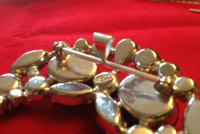 1950s Weiss Designer Half Crescent Brooch- signed on the reverse Weiss, silver tone metal, assorted styles of stones, blues, greens, and aurora stones. Excellent vintage condition. Please also see other brooch in different colour ways.