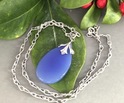 This is a beautiful elegant Art Nouveau Chalcedony Necklace with a large pendant set with an organic sterling silver setting with a magnificent cornflower blue stone. The silver top of the pendant has a lovely flowing art nouveau design. The chain is original and has been handcrafted, each link twists around itself and locks into the next link.