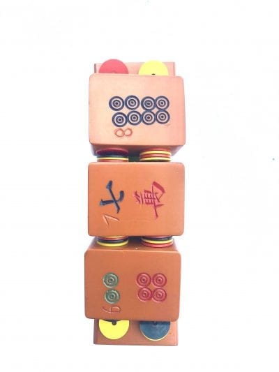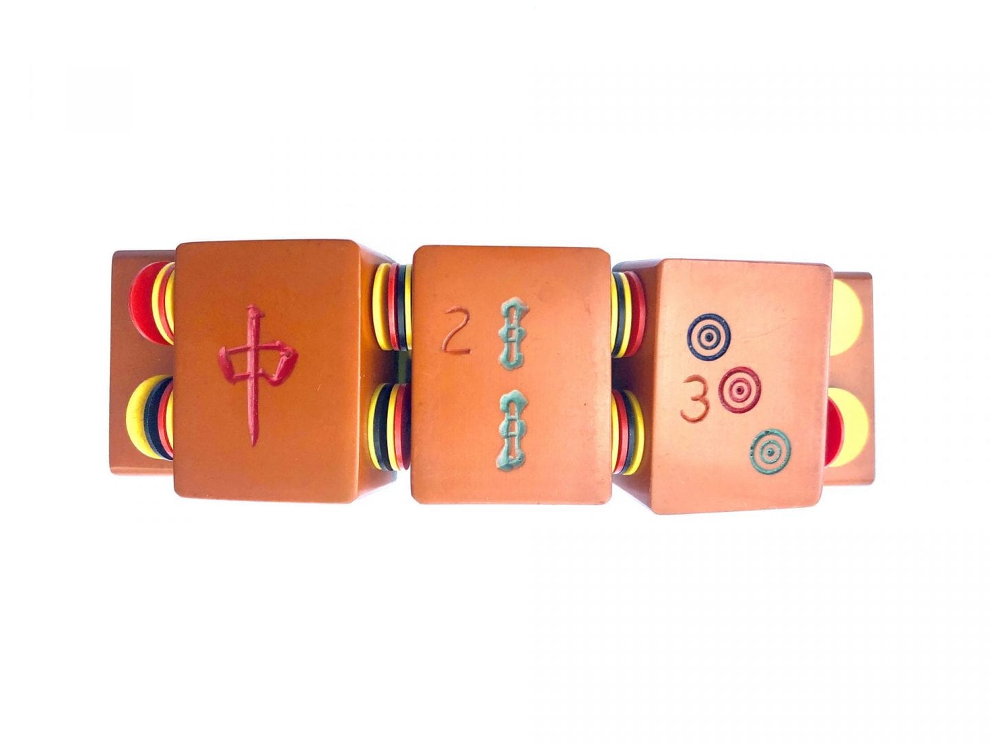 Amber and green Bakelite Mahjong tile, elasticated to form a bracelet, from the 1930s – 1950s, probably American. Each tile has a different number and pattern engraved on it. The early mahjong sets were made in Bakelite, this changed many years ago to plastic as we now know it.