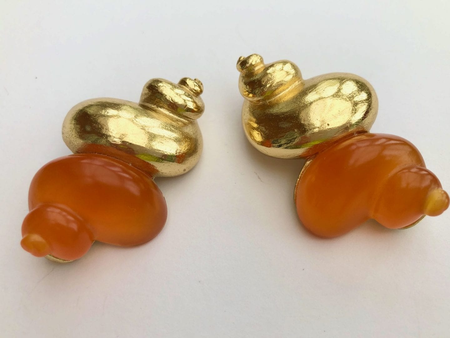 Exquisite Christian Dior orange shell earrings from the 1980s. Created in order to support the launch of the Dune perfume. The large earrings have a shell shape of gold coloured metal with orange/red lucite. These have the wow factor.