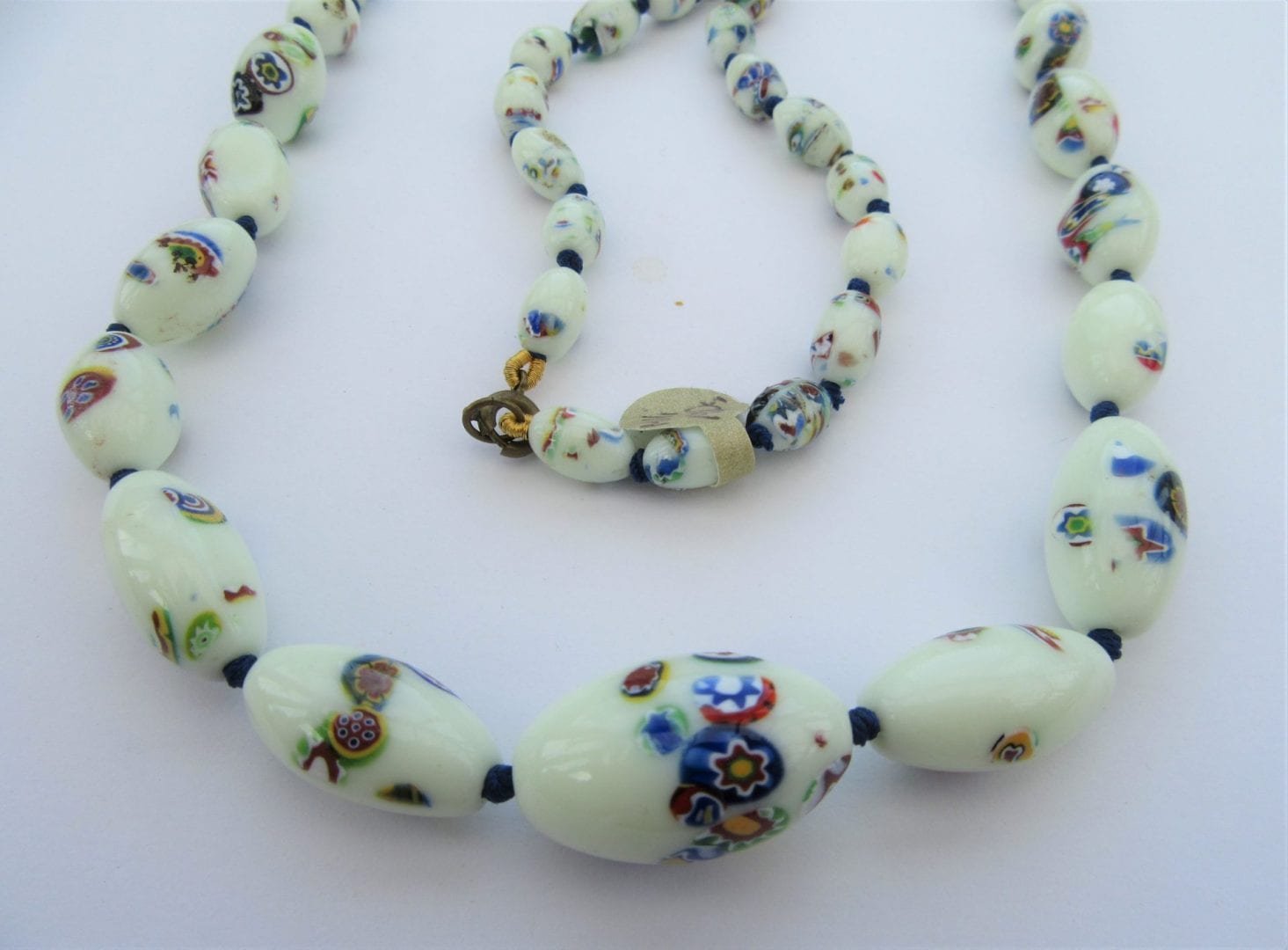 These Millifiori Uranium czech glass beads are an unusual cream colour. It is also very unusual to find these in an uranium glass. This means when you shine an ultra violet light on them, they will glow. The beads have splashes of the multi colour Millifiori pattern through them. They have been professionally re knotted using dark blue thread.