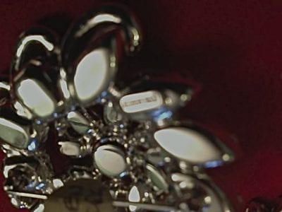 What a fabulous sparkly set, signed Eisenberg on the Brooch & Earrings. Various shaped Ice Blue stones and clear rhinestones (item is slightly bluer and sparkly than photos) – Quality item -original and not a copy. Sorry photo of name isn’t very good and the photos don’t do justice to this either. It is far more breathtaking in real life.