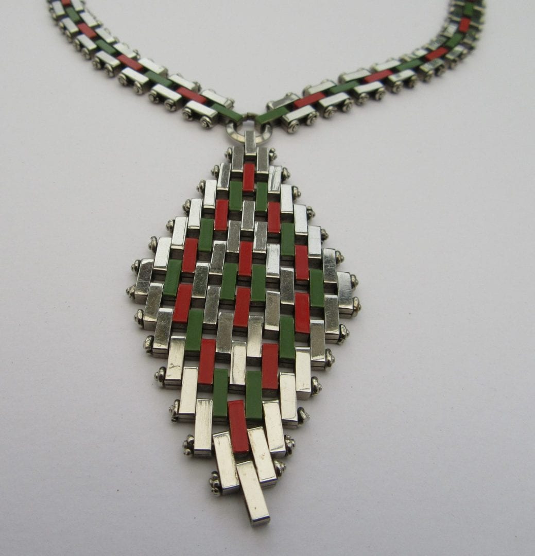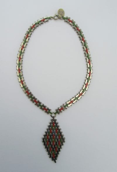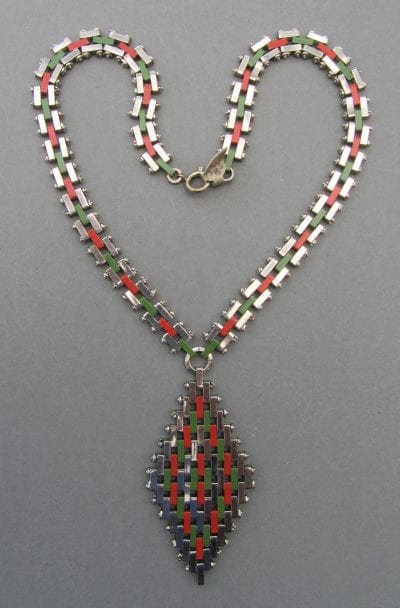 Jakob Bengel 1920s Brickwork Necklace in a lovely orange and green cold painted enamel brickwork (maerwerk). Bengel was famous for his chain linking designs. This is a lovely beauty with the additional diamond shape pendant. This design is well published in both of the Jakob Bengel books, but this colour combination is more unusual. it is often found in red and black, green and black, red, blue and I have had it in lime green.