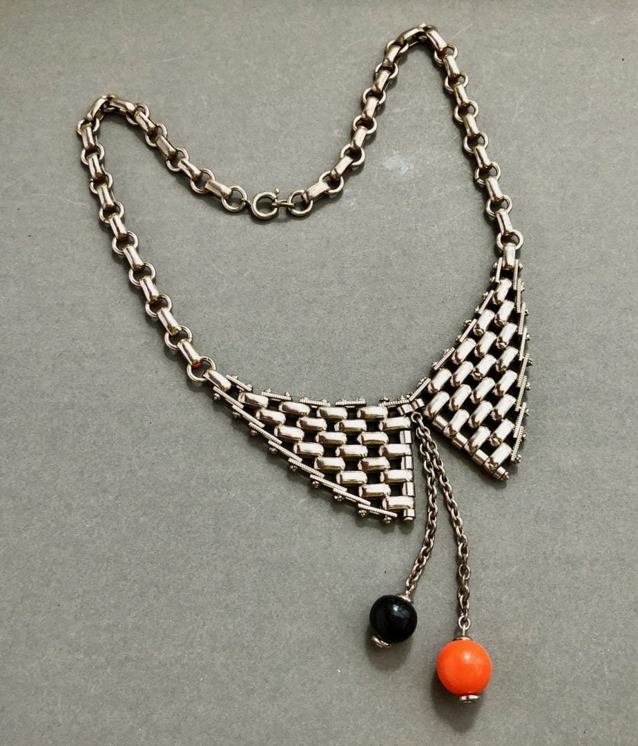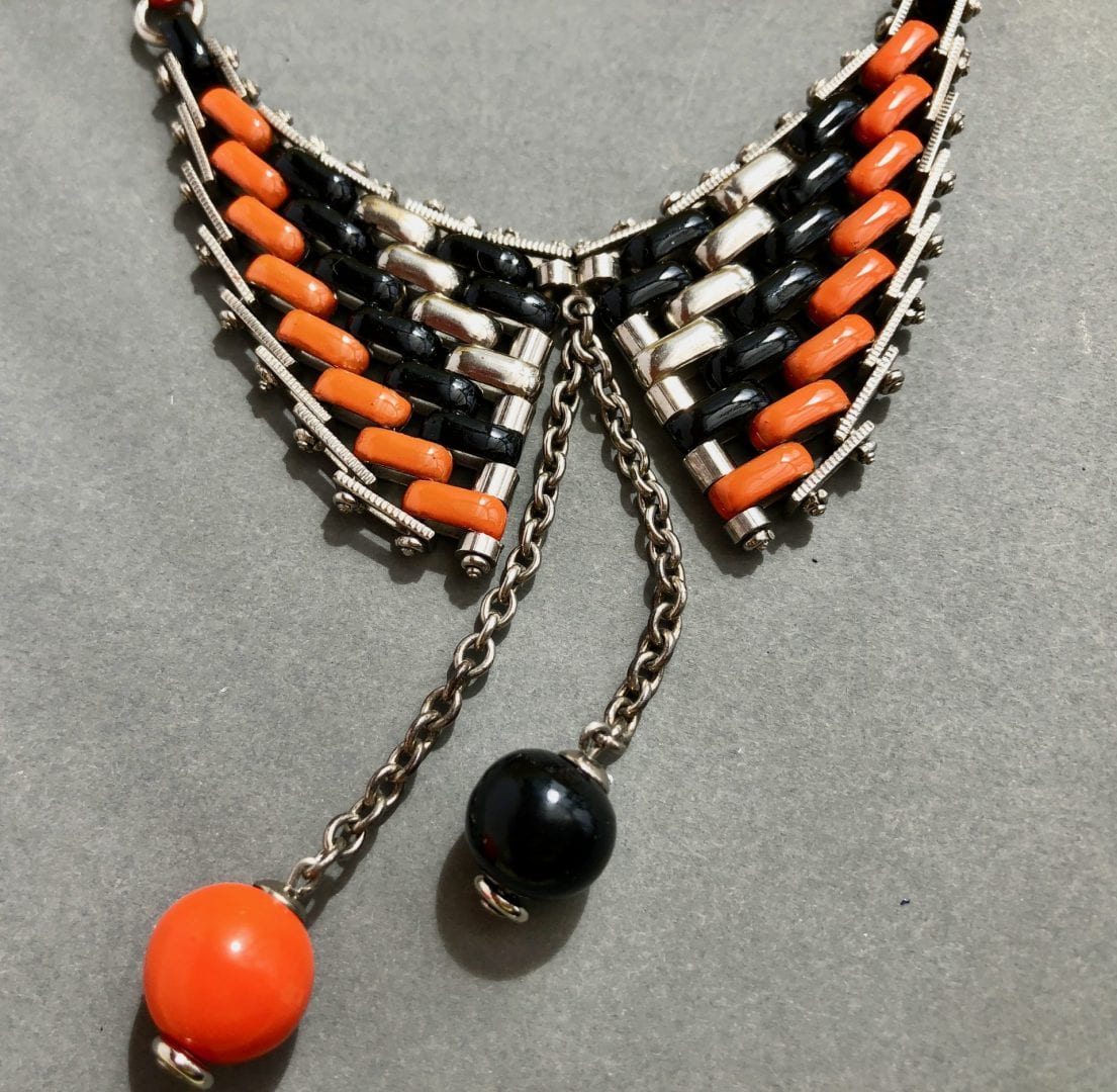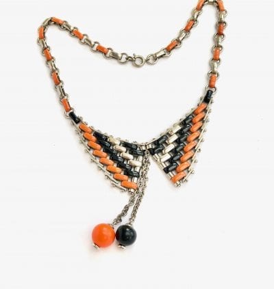 Jakob Bengel 1920s orange and black cold painted enamel brickwork necklace. Bengel was famous for his chain linking designs and this is one of his finest. It is referred to as maerwerk (masonry) brickwork design, you will see many pictures of this design in either of the 2 Jakob Bengel books.
