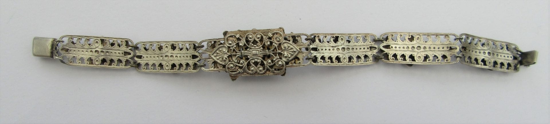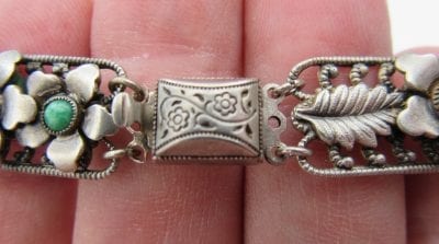This Neiger 1930s Flower Bracelet with flowers and leaf motives is in fabulous condition. A very attractive bracelet with peking glass cabochon stones in a silver plated filigree frame. There is a typical Neiger push in clasp and has all the Neiger identifying symbols and a great length.