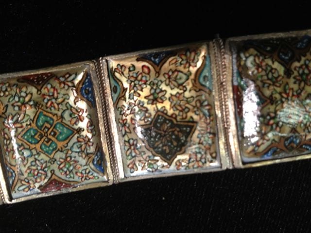 Set in low grade silver with push in clasp. The white flashes on the panels are due to camera flash. There is an impressed mark to the clasp but I cannot identify this, it maybe a foreign hallmark or an islamic mark. There are a couple of small spots of enamel paint missing on a couple of edges, but overall in great antique condition.