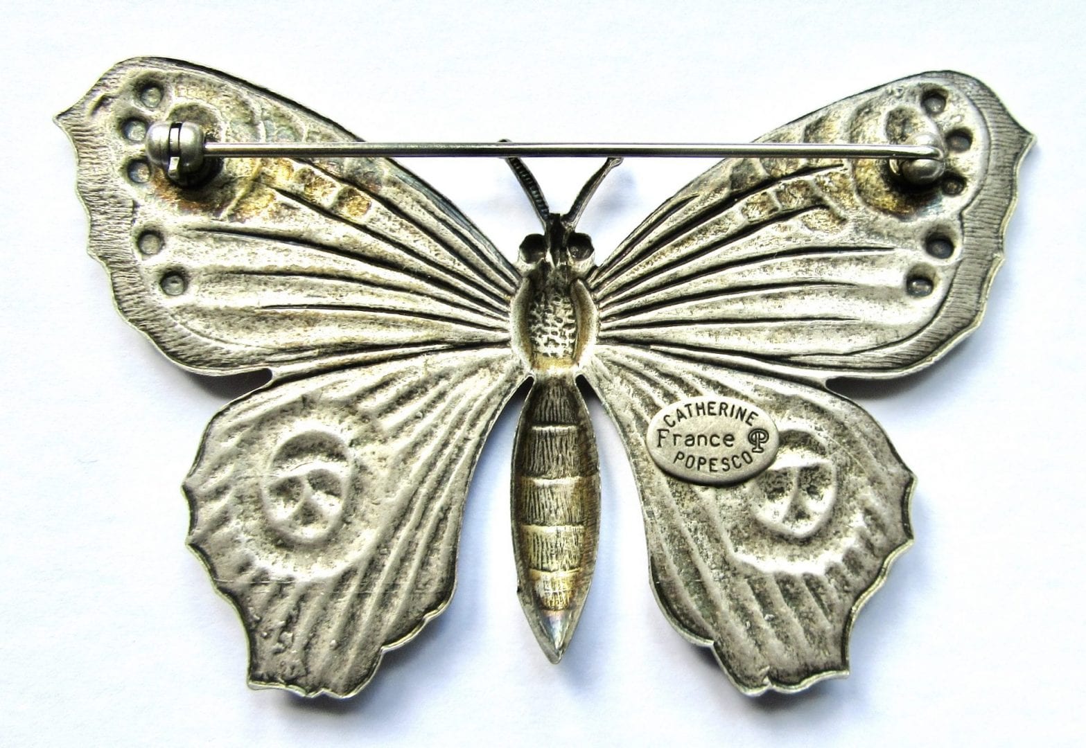Purple, Green and silver tone Popesco Butterfly Enamel Brooch by Catherine Popesco. Not sure of age possibly 1980s/1990s. Great detail with splashes of gold on the wings and a lime green spot on each wing. Roll over c safety catch and signed to the back.
