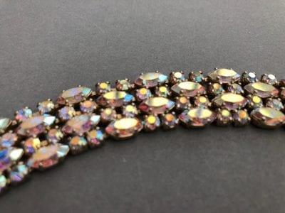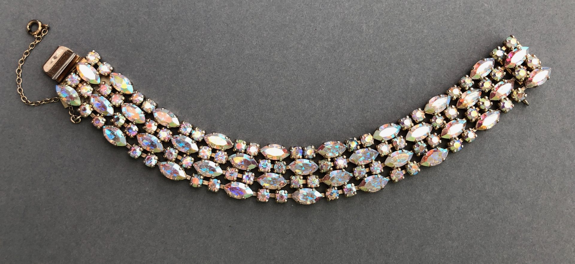 Sherman 1950s bracelet with aurora borealis Swarovski marquise and round stones. Signed on the clasp and has a safety chain. Stones are in excellent order no chips or cracks and is a good length.