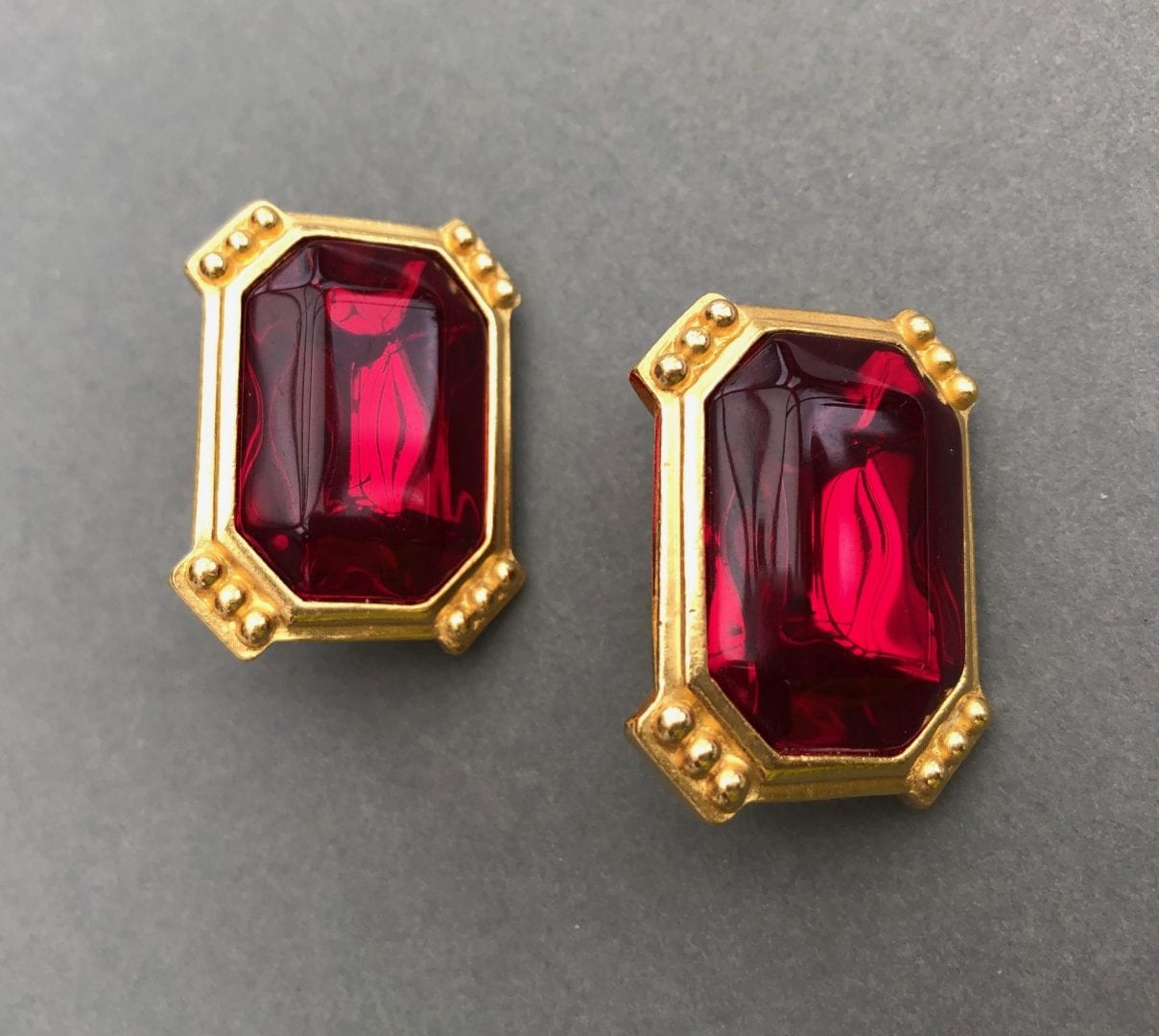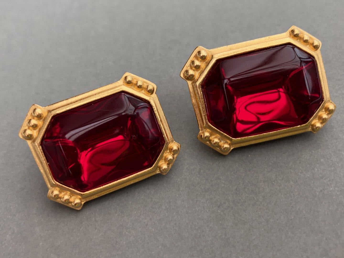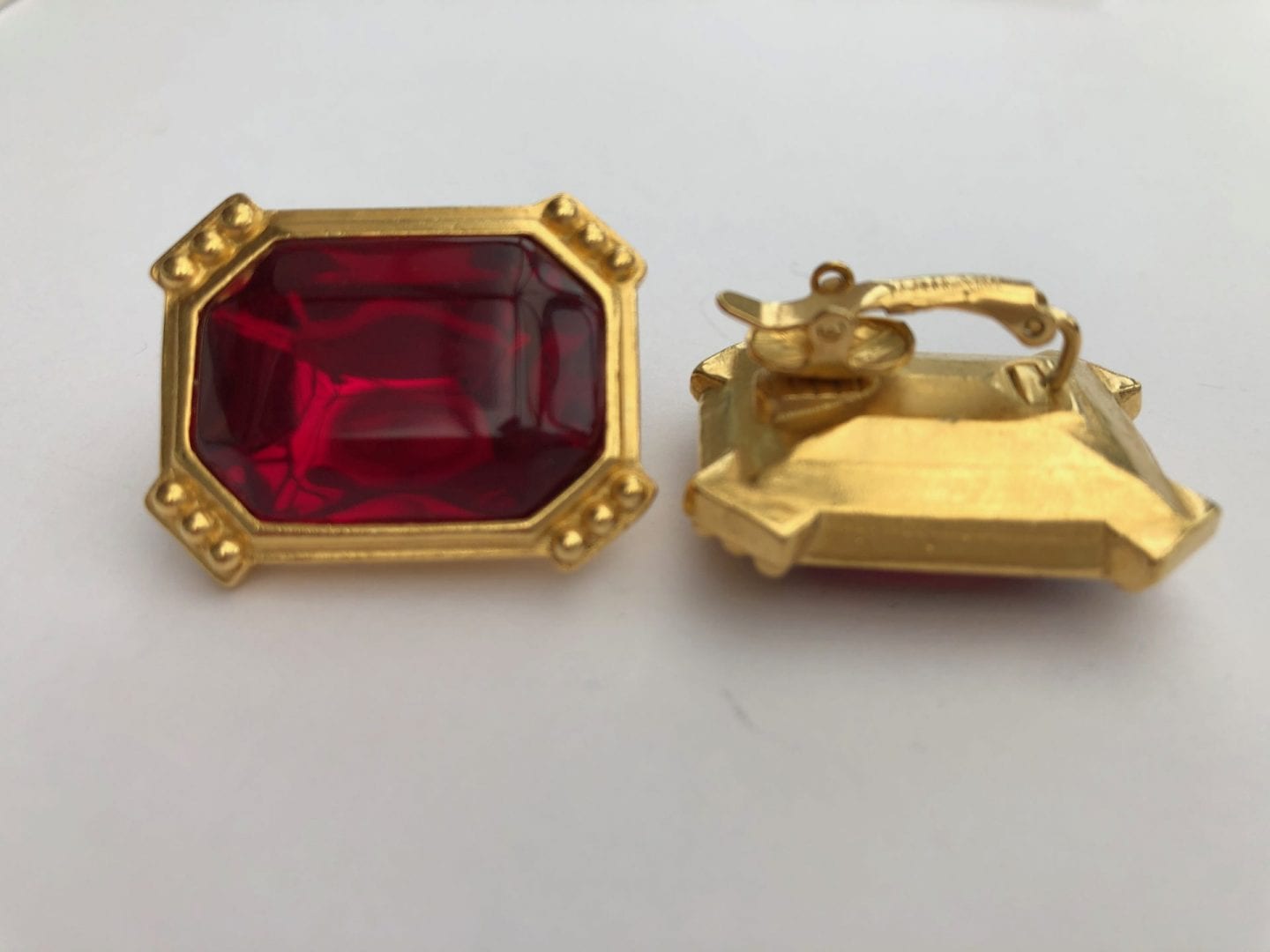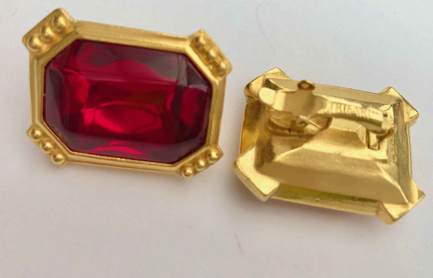 Trifari 1980s Ruby Red oblong earrings in a rich 24 ct warm gold tone colour. Very typical of the 1980s period, large shape to match the shoulder pad era, with cut off corners with ball decoration.