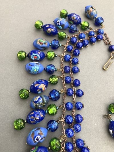 1940s Millefiori Fringe Necklace with foil beads. This necklace certainly has the WOW factor. Quite an assortment of beads and colours through this necklace. There are deep cornflower and darker blue millefiori lava beads, iridescence lime green and blue small foils and 2 rows of lapis blue beads. They are on a copper coloured chain and then the ‘fringe’ beads hang off that in two different combinations creating the ‘fringe’ effect.