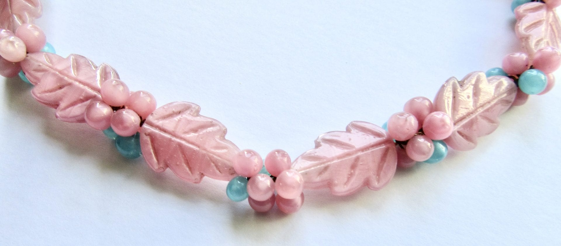 Pink & Blue satin glass Vintage Czech Leaf Necklace from the 1930s. Very pretty necklace, the leaves are graduated, large ones at the front, interspersed with pink and turquoise blue balls (to depict berries). Has a screw clasp.