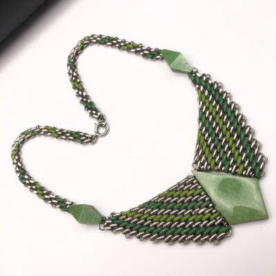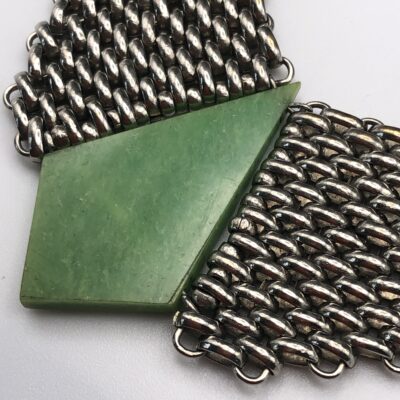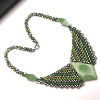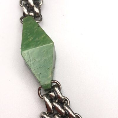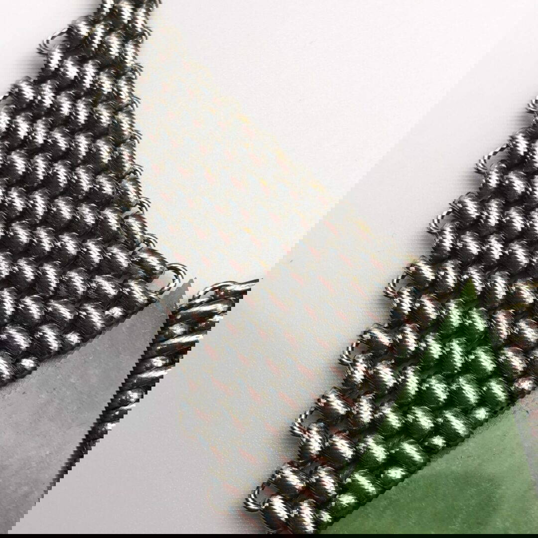 Vintage Jacob Bengel Brickwork (Mauerwerk) Green Bakelite Necklace, famous brickwork necklace with green cold painted enamel and jade green bakelite/galalith panels/beads. WOW this is a fabulous piece, quite unique for the brickwork patterned necklace to have these 3 unique galalith/bakelite panels.