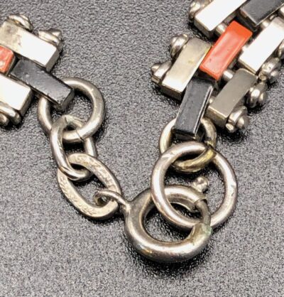 There is little wear on the back just a few black marks, very minor but noted for accuracy. Should be able to be seen in the photos, so please check. Paintwork is excellent. There is a bolt ring clasp and the brickwork links are of the flat shape design. There is a mark on the clasp ring which reads – ‘Guarantee’ which is often found on Bengel pieces.