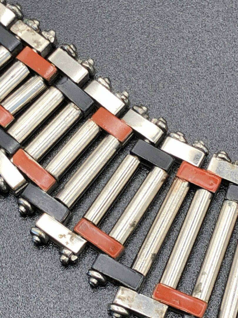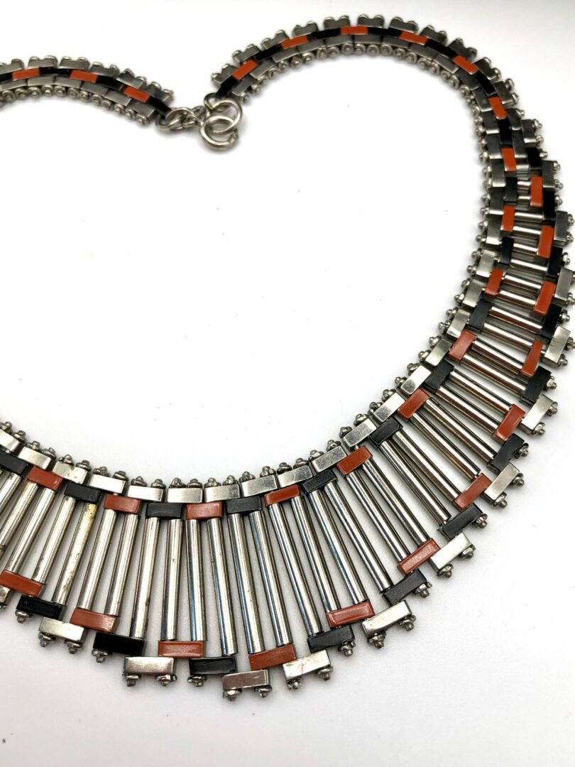 Vintage Jacob Bengel Brickwork (Mauerwerk) Orange and Black Necklace, famous brickwork necklace with orange and black cold painted enamel. WOW this is a fabulous piece, quite unique for the brickwork pattern and the metal tubes in different lengths to create a curved shaped necklace.