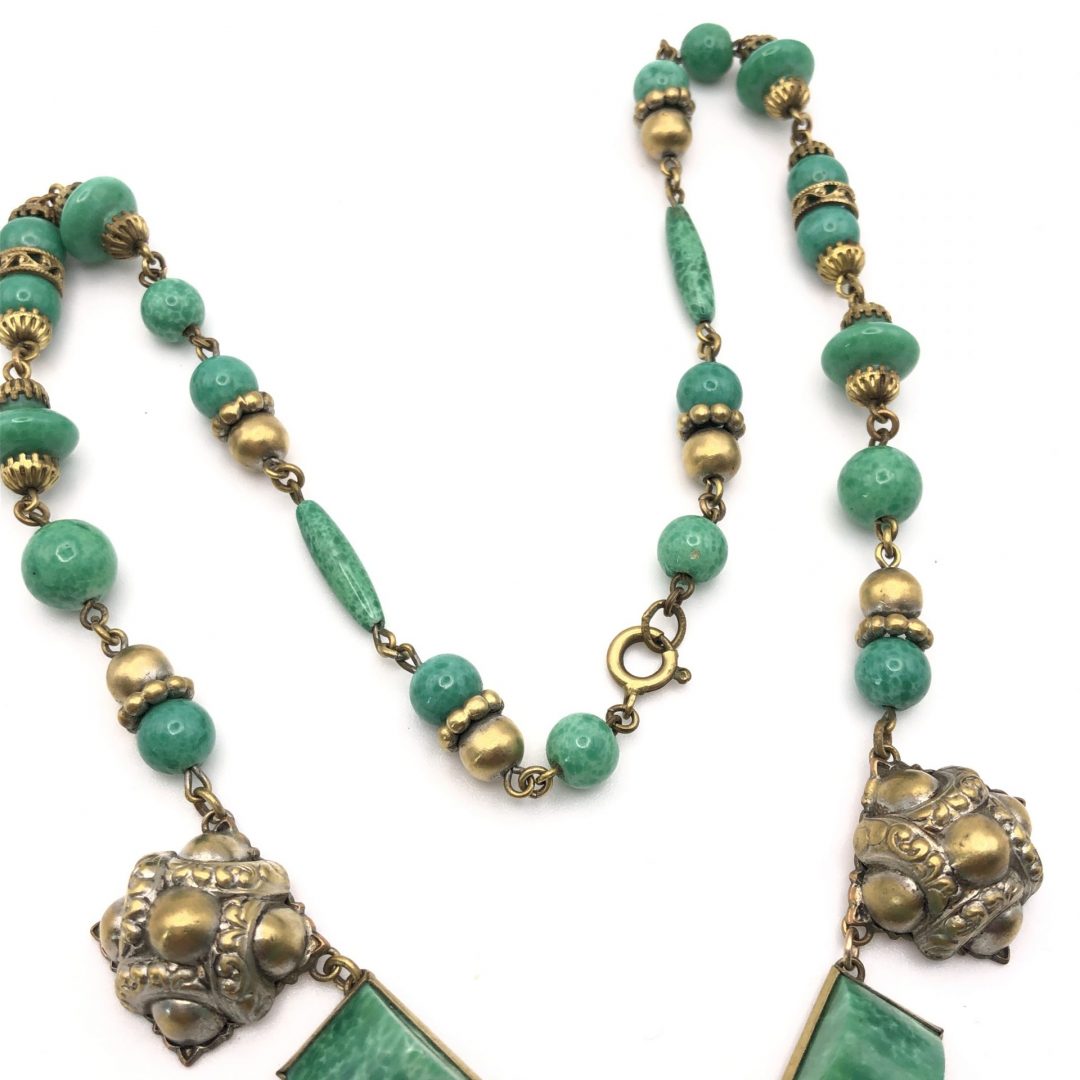 1920s Neiger Green stone panel and metal ornate panels with a beaded necklace. Lots of interesting different bead shapes and bead caps and spacers incorporated in this piece. Has a bolt ring clasp with Czechoslovakia impressed on it